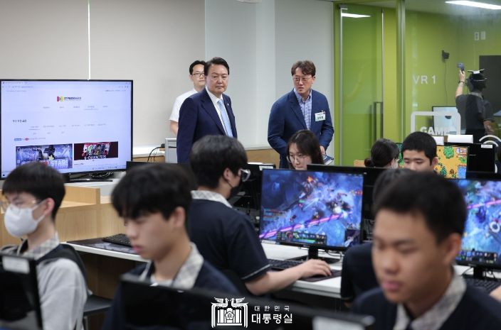 대통령은 먼저, 게임분석실을 들려 학생들이 다양한 게임을 체험하고 수요자 입장에서 게임의 특징, 구성 등을 분석하는 모습을 둘러보았다. 또한, 경기게임마이스터고에서 자체 개발한 ‘디지털 기반 학습 및 취업지원 시스템’*에 대한 설명을 들었다.