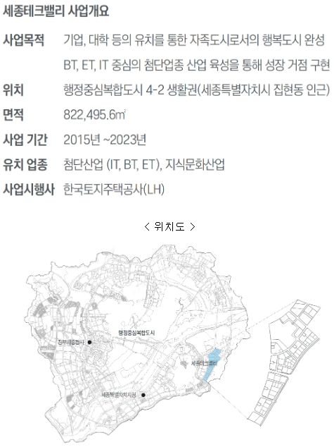 총 면적 82만 2,495.6제곱미터(㎡)에 달하는 도시첨단산업단지(세종테크밸리)는 세종시 도심에 위치한 유일한 산업단지로 첨단업종과 지식문화산업, 그 밖에도 융‧복합 산업에 필요한 업종까지 입주할 수 있다. 우수한 입지여건, 저렴한 분양가와 세제혜택으로 그간의 8차 분양에서 높은 경쟁률을 보여왔으며, 전체 54부지 중 44부지가 분양됐다.