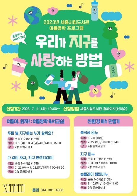[제주교통복지신문 김강석 기자] 세종시립도서관이 오는 11일부터 ‘생태·환경’을 주제로 한 여름방학 프로그램인 ‘우리가 지구를 사랑하는 방법’에 참여할 초등학생 70명을 선착순 모집한다.