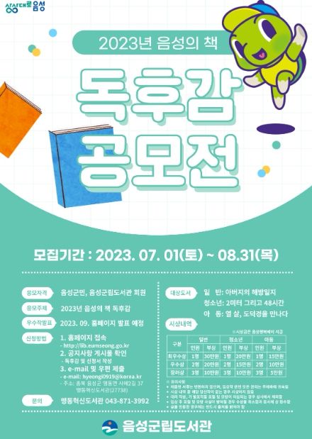 이번 공모전은 음성의 책을 함께 읽고 소통하며 독서와 글쓰기를 통해 책 읽는 즐거움을 일깨우기 위해 마련됐다.
