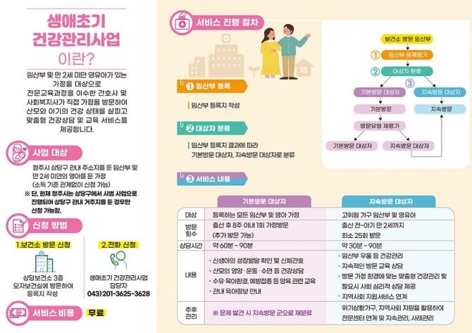 [제주교통복지신문 김강석 기자] 청주시 상당보건소는 7월부터 상당보건소 등록 임산부와 만 2세 미만 영유아 가정을 대상으로 ‘생애초기 건강관리사업’을 운영한다고 밝혔다.