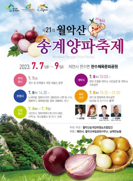 [제주교통복지신문 김강석 기자] 올해로 21번째를 맞이하는 월악산 송계 양파 축제가 오는 7일부터 9일까지 3일간 한수면 송계리 한수체육문화공원 일원에서 개최된다.