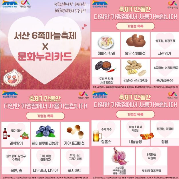 신현우 문화예술과장은 “서산6쪽마늘 축제에서 소외되는 분들이 없도록 문화누리카드 가맹점을 확대했다”라며 “서산6쪽마늘 축제에 참여해 다양한 프로그램을 즐기고 지역 농산물도 체험하고 가시길 바란다”라고 말했다.