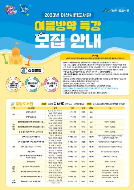 참가 신청은 배방·탕정·꿈샘도서관은 7월 5일, 중앙도서관은 7월 6일 오전 9시부터 아산시립도서관 누리집에서 선착순으로 진행된다.