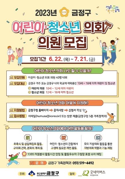[제주교통복지신문 김강석 기자] 부산 금정구는 ‘2023년 금정구 어린이・청소년의회’에서 활동할 어린이·청소년 의원 40명을 오는 21일까지 모집한다.