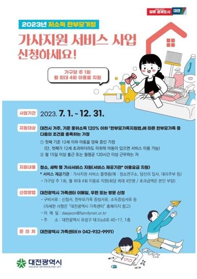 지원대상은 대전시 거주 기준 중위소득 120%이하 한부모가정으로, 월 15일 이상 출근 또는 월평균 120시간 이상 근무하면서 12세 이하의 아동을 양육 중인(단, 첫째가 12세 초과하더라도 미취학 아동이 있으면 서비스 이용 가능) 가정이다. 지원 가구당 주 1회의 가사서비스 이용료(회당 최대 4만 원)를 지원할 예정이며, 초과 금액은 본인이 부담한다.