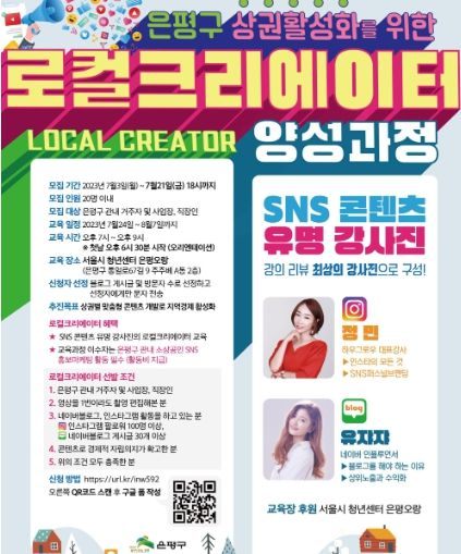 [제주교통복지신문 김강석 기자] 서울 은평구는 지역경제에 활기를 불어넣고자 지역 가게와 소상공인을 홍보하는 ‘로컬 크리에이터 양성과정’ 참여자를 오는 21일까지 모집한다.