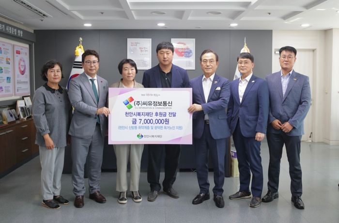 [제주교통복지신문 김강석 기자] ㈜씨유정보통신은 4일 신방동 취약계층과 광덕면 홀몸어르신 지원을 위해 후원금 700만 원을 천안시복지재단에 기탁했다.