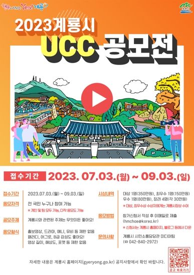 [제주교통복지신문 김강석 기자] 계룡시는 전국민을 대상으로 ‘2023 계룡시 UCC 영상 공모전’을 개최한다고 밝혔다.