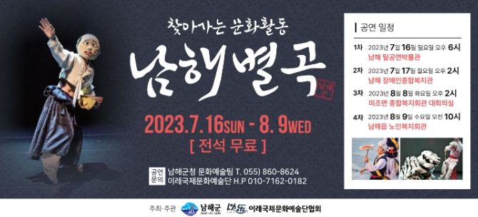 공연은 4차례 진행되며, 7월 16일 오후 6시 남해탈공연박물관, 7월17일 오후2시 남해장애인종합복지관, 8월8일 오후2시 미조면 종합복지회관, 8월9일 오전 10시 남해읍 노인복지회관에서 열린다.
