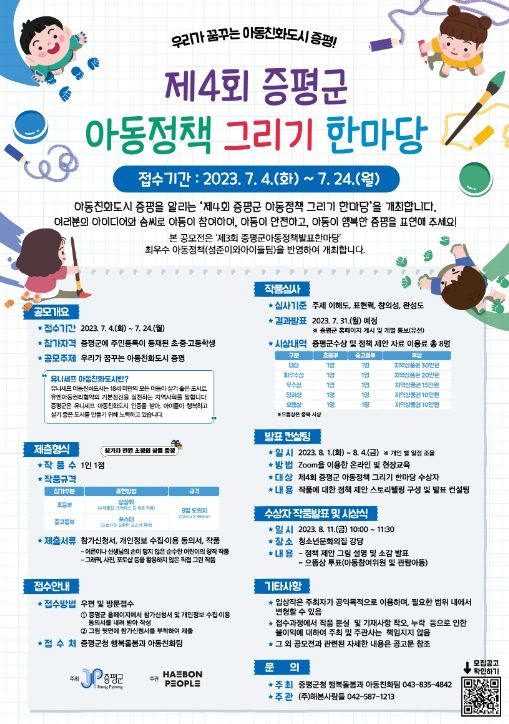[제주교통복지신문 김강석 기자] 아동친화도시 증평군이 제4회 증평군 아동정책 그리기 한마당을 위한 참가자를 7월 24일까지 모집한다.