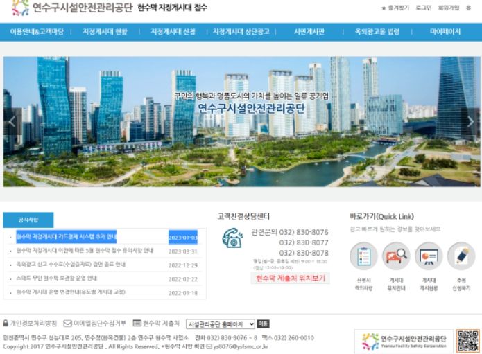 현수막 지정게시대, 상단광고, 시민게시판 이용을 원하는 사용자는 연수구시설안전관리공단 홈페이지 내 현수막 지정게시대 접수페이지를 통해 신청이 가능하다.