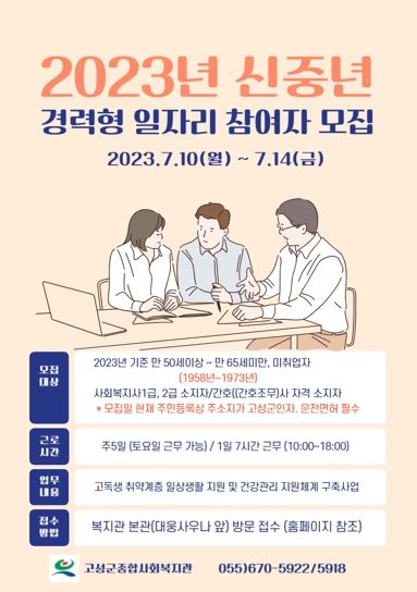 [제주교통복지신문 김강석 기자] 고성군종합사회복지관은 7월 10일부터 7월 14일까지 신중년 경력형 일자리사업에 참여할 참가자를 추가로 모집한다.