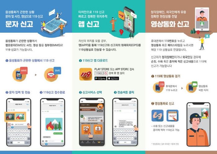 '119다매체신고서비스'는 신고자와 119상황요원 간의 영상통화는 물론 문자, 앱(App)으로도 신고가 가능해, 청각장애인 등 의사소통이 어렵거나 음성통화가 곤란한 경우 긴급 상황을 전달할 수 있다.