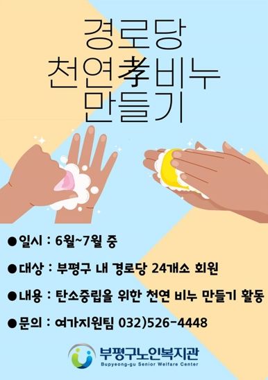 [제주교통복지신문 김강석 기자] 부평구노인복지관은 경로당 24개소 어르신 280명을 대상으로 천연재료를 활용해 액체비누대신 탄소저감을 위해 고체비누를 제작하는 ‘천연 孝 비누 만들기’ 프로그램을 진행한다고 밝혔다.