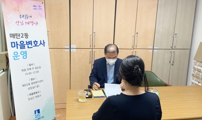 [제주교통복지신문 김강석 기자] 수원시 매탄2동은 마을변호사의 재능기부로 운영 중인 주민들을 위한 무료법률상담이 큰 호응을 얻고 있다고 밝혔다.
