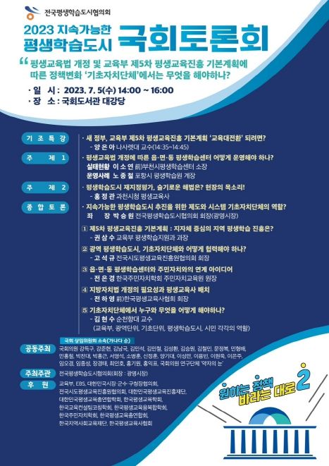 기조특강은 나사렛대학교 양은아 교수가 ‘제5차 평생교육진흥 기본계획, 교육대전환 되려면’을 주제로 진행한다. 이어 주제 발표는 이소연 전 부천시평생학습센터 소장과 노종철 포항시 평생학습원 계장이 ‘평생교육법 개정에 따른 ‘읍·면·동 평생학습센터 운영방안’을, 홍정관 과천시 평생교육사가 ‘평생학습도시 재지정 평가, 슬기로운 해법과 현장 목소리’를 각각 발표한다.