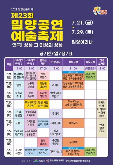 [제주교통복지신문 김강석 기자] 대한민국 대표 연극축제인 제23회 밀양공연예술축제가 오는 7월 21일부터 29일까지 9일간 밀양아리나에서 개최된다.
