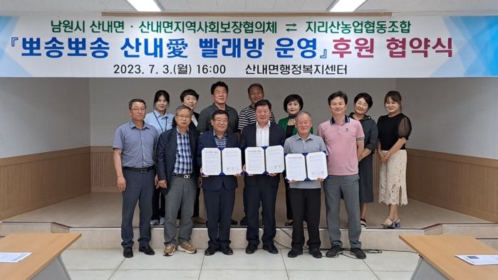 [제주교통복지신문 김강석 기자] 남원시 산내면과 지역사회보장협의체, 지리산농업협동조합은 7월 3일 산내면행정복지센터에서 '뽀송뽀송 산내愛 빨래방 운영' 후원을 위한 협약(MOU)을 체결했다.