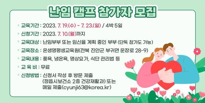 대상자는 난임부부 또는 임신을 계획 중인 부부로, 신청방법은 7월 10일까지 신청서를 가지고 정읍시보건소 2층 건강재활과로 방문하거나 이메일로 제출하면 된다. 참가비는 전액 무료다.