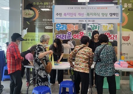 특히 주민들과 함께 캠페인의 주제를 적고 외치면서 이웃에 대한 세심한 관심을 유도했다. 복지사각지대 안내문과 홍보물품 배부하면서 어려운 상황에 처한 이웃을 발견하면 언제든지 신고할 수 있도록 홍보하는 의미 있는 자리가 됐다.