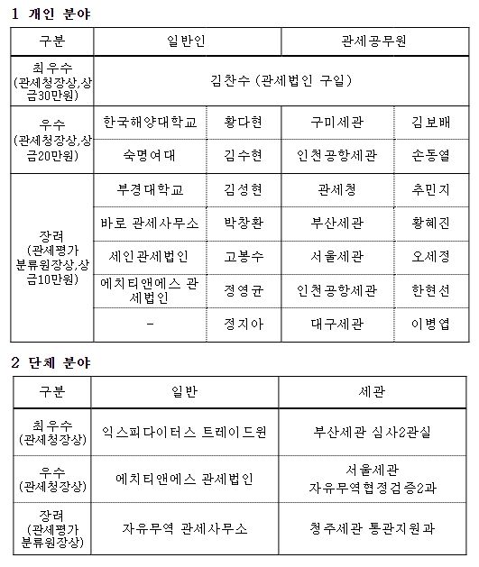 응시자 중 개인 15명(최우수 1, 우수 4, 장려 10) 및 단체 6팀(최우수 2, 우수 2, 장려 2)이 수상의 영예를 차지했고, 개인 최우수상은 김찬수(관세법인 구일)가, 단체 최우수상은 익스피다이터스 트레이드윈(일반), 부산세관 심사2관실(세관)이 수상했다. (붙임 참고)