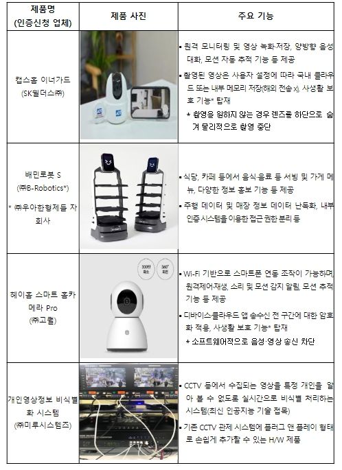 이를 위해 지난해 소비자단체 합동 실태점검 결과와 국제 표준, 국내외 사례 등을 참고하여 구체적인 인증기준과 평가방법 초안을 마련한 데 이어, 올해에는 한국인터넷진흥원을 통해 PbD 인증에 참여를 희망하는 기업의 신청(4~5월)을 받아, 일상생활 속에서 쉽게 접할 수 있는 가정용 CCTV, 자율주행 서빙로봇 등 3종 4개 시범인증 대상 제품을 선정하여, 개인정보 보호 중심 설계에 대한 검증 및 평가를 실시할 예정이다.
