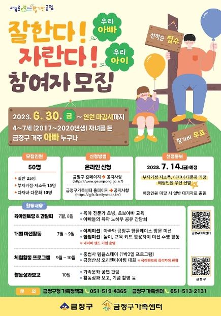 신청 자격은 4~7세(2017~2020년 출생) 자녀와 함께 할 금정구에 거주하는 아빠 누구나 신청하면 된다. 금정구 홈페이지 및 금정구가족센터에서 선착순으로 50명을 모집하며, 참가비는 무료다.