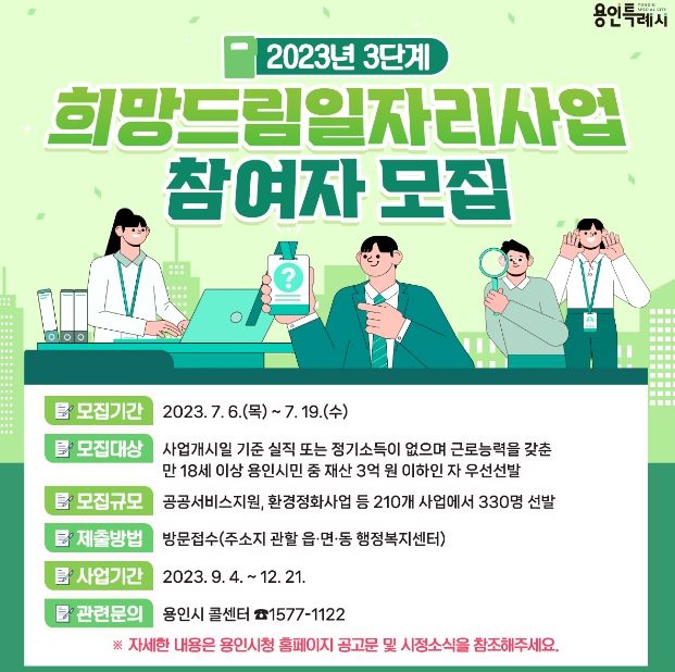 [제주교통복지신문 김강석 기자] 용인특례시가 6일부터 19일까지 '2023년 3단계 희망드림 일자리' 사업 참여자 330명을 모집한다고 5일 밝혔다.
