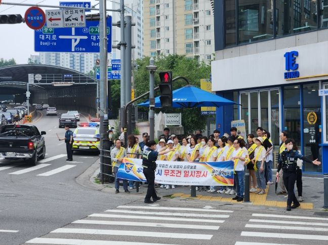 또 시민들에게 보행 안전 수칙이 담긴 안내문을 나눠주며, 횡단보도를 건너기 전 우회전 차량 접근 여부를 반드시 확인할 것을 당부했다.