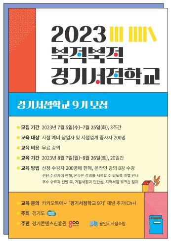 [제주교통복지신문 김강석 기자] 경기도와 경기콘텐츠진흥원이 7월 5일부터 25일까지 서점 예비 창업자와 업계 종사자를 위한 ‘2023 북적북적 경기서점학교’ 교육생을 모집한다.