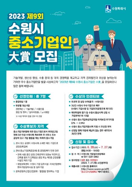 수원시 관계자는 “우수 중소기업을 발굴하고 시상해 기업인의 자긍심과 영예를 높이겠다”며 “선정된 기업이 경쟁력을 강화하고, 성장할 수 있도록 지원을 아끼지 않겠다”고 말했다.