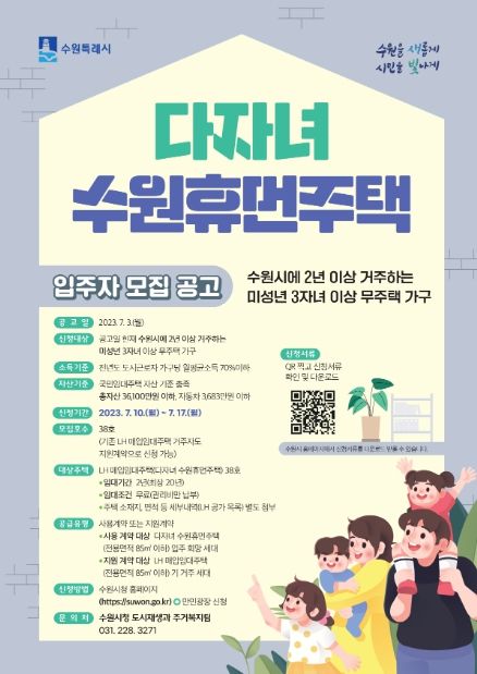 7월 10일부터 17일까지 모집하고, 대상은 공고일(7월 3일) 기준으로 수원시에서 2년 이상 연속 거주한, 미성년 자녀가 3인 이상인 무주택 다자녀 가구다.