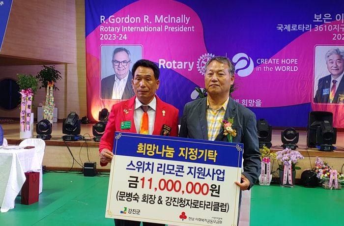 [제주교통복지신문 김강석 기자] 지난 4일, 강진청자로타리클럽과 강진청자로타리클럽에 새롭게 취임한 문병숙 회장이 각 550만 원씩 총 1,100만 원을 강진군에 기탁했다.