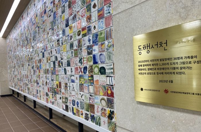 [제주교통복지신문 김강석 기자] ‘사람이 소중한 교육복지’를 실현 중인 서천군 청사에 발달장애인들이 만든 천여 개의 도자타일로 조합한 대형 벽화가 등장해 눈길을 끌고 있다.