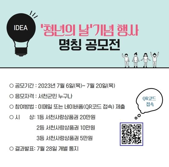 [제주교통복지신문 김강석 기자] 서천군이 청년정책에 대한 군민들의 관심과 참여를 유도하고자 6일부터 20일까지‘청년의 날’ 기념행사 ‘명칭’ 공모를 실시한다.