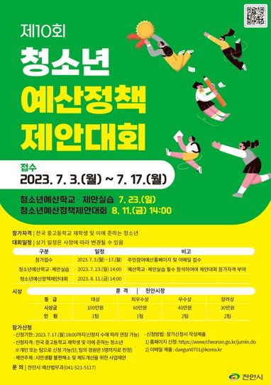 참가 대상은 전국 중고등학교 재학생 또는 이에 준하는 청소년이고, 신청은 7월 3일부터 17일까지 천안시 주민참여예산 누리집에서 할 수 있다.