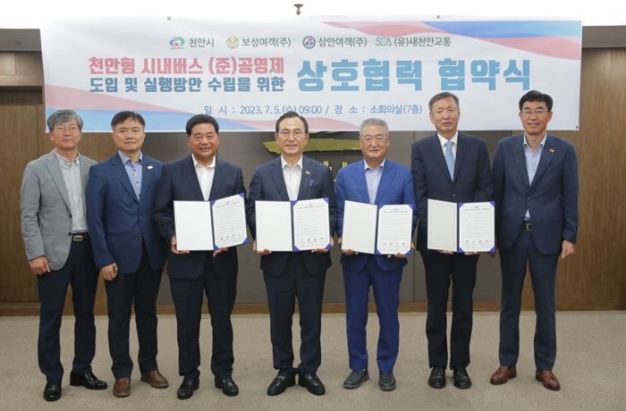 [제주교통복지신문 김강석 기자] 천안시는 5일 오전 시청 소회의실에서 지역 내 시내버스 3사인 보성여객, 삼안여객, 새천안교통과 시내버스 (준)공영제 도입을 위한 상호협력 협약을 체결했다.