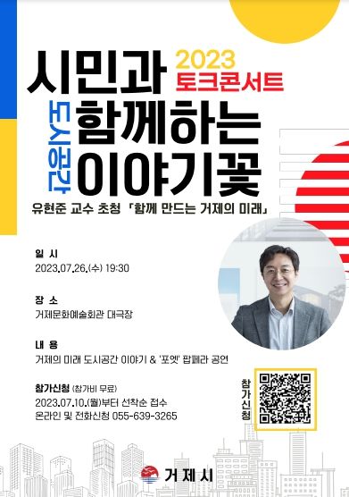 이 번 토크콘서트는 건축 및 도시공간 분야 전문가인 홍익대학교 유현준 교수를 초빙해 ‘함께 만드는 거제의 미래’라는 주제로 진행된다.