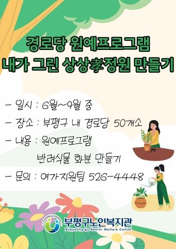 [제주교통복지신문 김강석 기자] 부평구노인복지관은 경로당 50개소 회원 770명을 대상으로 반려식물 화분을 관리하는 과정을 통해 풍요로운 삶과 균형을 찾을 수 있는 ‘내가 그린 상상 孝정원 만들기’ 프로그램을 진행한다고 밝혔다.
