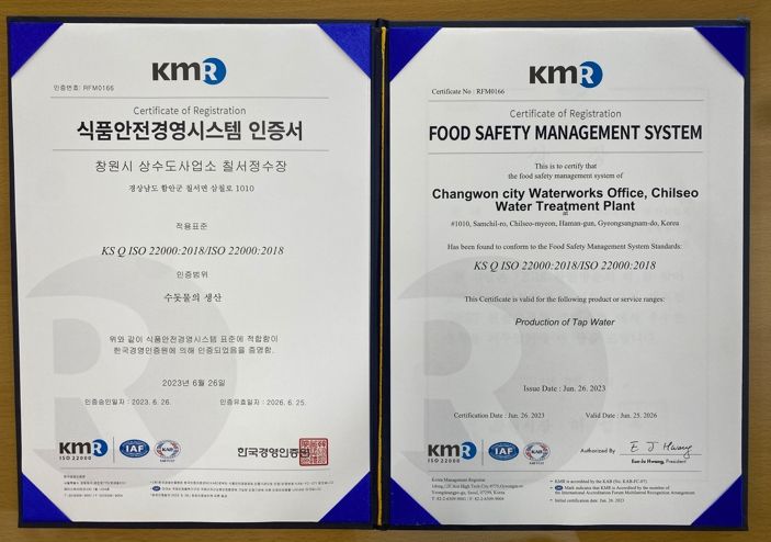 국제표준화기구(ISO)에서 제정한 ISO 22000(식품안전경영시스템)은 식품의 제조, 가공, 유통, 보존, 판매단계 등 전 과정의 위해요소를 사전에 차단하고 체계적으로 관리하는 국제표준규격으로 창원특례시 최대 수돗물 공급처인 칠서정수장은 올해 1월부터 수돗물 생산 전 과정에 인증을 추진하여 심사를 통해 지난 6월 26일부터 승인을 완료했다.