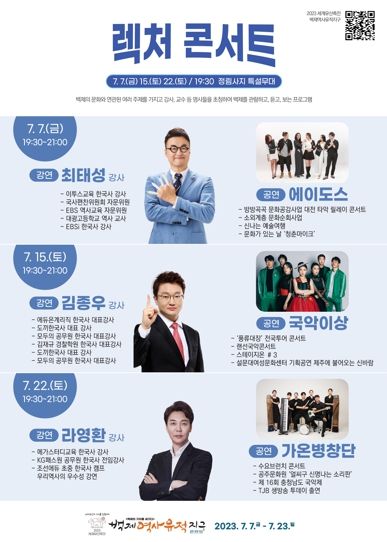 ‘렉처콘서트’는 강연과 공연이 결합된 콘서트형 강의로, 백제의 가치를 재밌고 간단하게 즐길 수 있다. 서경덕 교수, 최태성·라영환·김종우 강사 등 명사의 강연과 음악공연 순으로 진행된다.