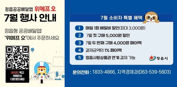 [제주교통복지신문 김강석 기자] 민선8기 정읍시의 핵심 공약인 정읍형 공공배달앱 ‘위메프 오’가 지난 5월 출시 이후 시민들의 큰 호응을 얻으며 순항하고 있다.