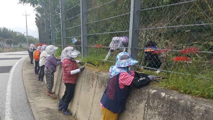 이날 제초 작업은 아름답고 깨끗한 도로 환경개선을 위해 강진면 회진리에서 용수리까지 약 6km 구간을 이른 새벽부터 20여 명의 생활개선 회원이 동참했다.