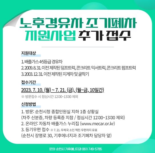 순천시 관계자는 “정원도시에 걸맞은 대기환경 개선과 탄소중립을 위해 이번 노후경유차 조기폐차 지원사업에 많은 참여를 부탁드린다”라고 말했다.