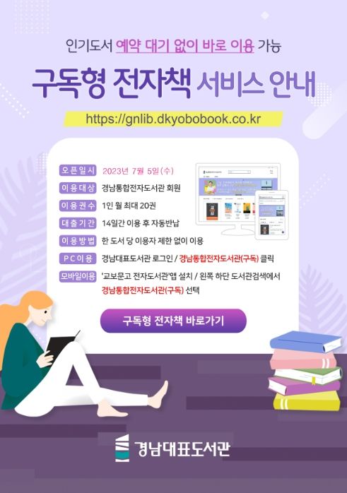 [제주교통복지신문 김강석 기자] 경남대표도서관은 도민의 자유로운 정보 접근 활성화와 정보습득 즉시성 제고를 위해 ‘구독형 전자책 서비스’를 7월 5일부터 본격 운영한다.