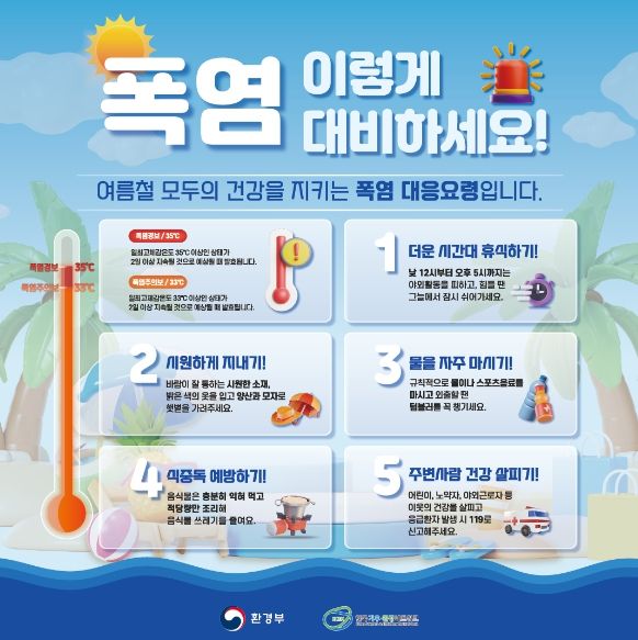 폭염 시 주요 행동요령은 ▲ 더운 시간대 휴식하기 ▲ 시원하게 지내기 ▲ 물을 자주 마시기 ▲ 식중독 예방하기 ▲ 주변사람 건강 살피기 등이다.