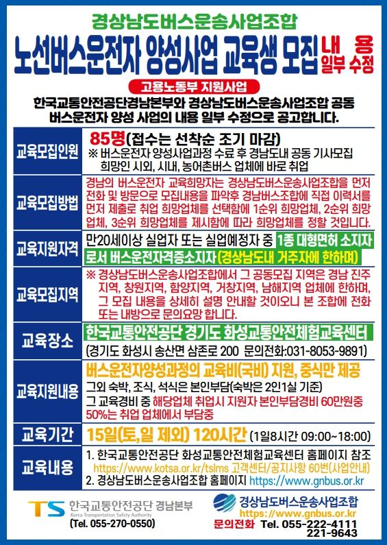 [제주교통복지신문 김강석 기자] 한국교통안전공단 경남본부와 경상남도버스운송사업조합은 노선버스 운전자 부족 문제를 해결하고, 도민 일자리 창출을 위해 고용노동부 지원사업인 ‘노선버스 운전자 양성사업’ 교육생을 모집한다고 밝혔다.