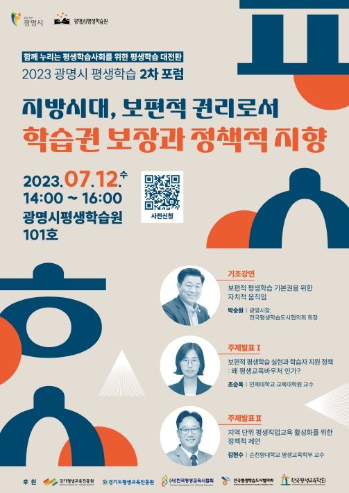 ‘2023 광명시 평생학습 2차 포럼’은 광명시민 누구나 참여할 수 있다. 포스터 내 QR 코드를 통해 오는 10일까지 사전 신청을 받으며, 행사 당일 현장 신청도 가능하다.