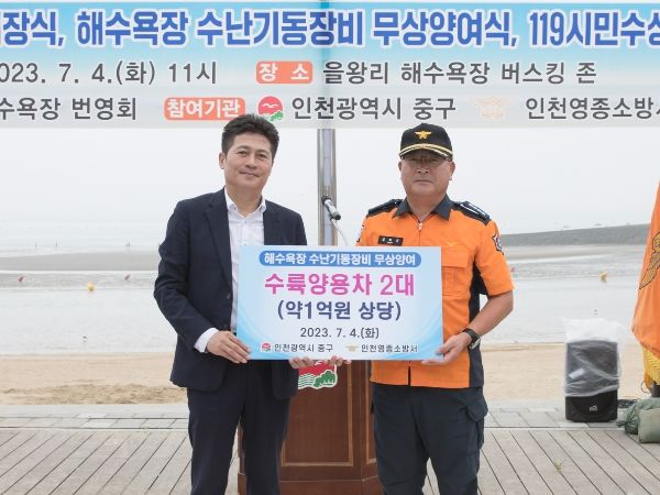 [제주교통복지신문 김강석 기자] 본격적인 여름 휴가철을 맞아 인천시 중구가 ‘해수욕장 안전사고 제로(0)화’를 위해 인천 영종소방서에 ‘수난기동장비’를 무상으로 지원했다.